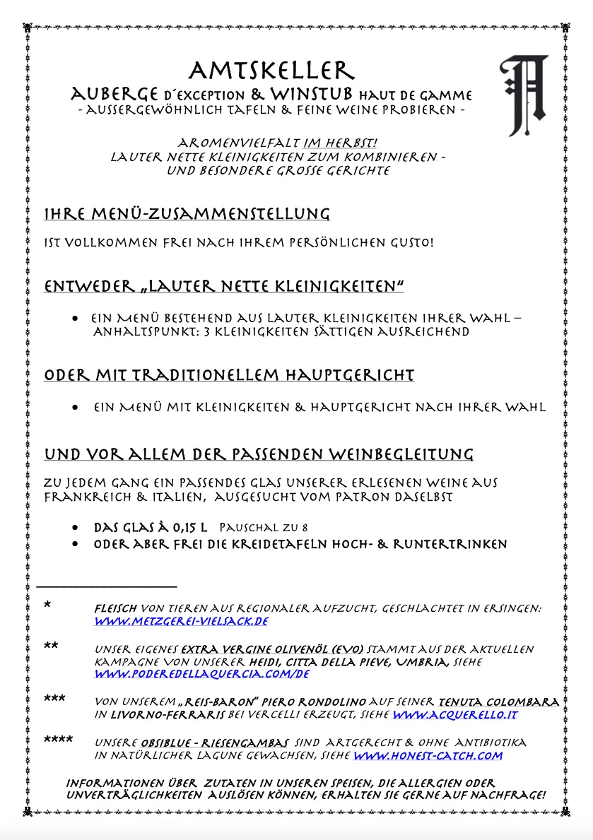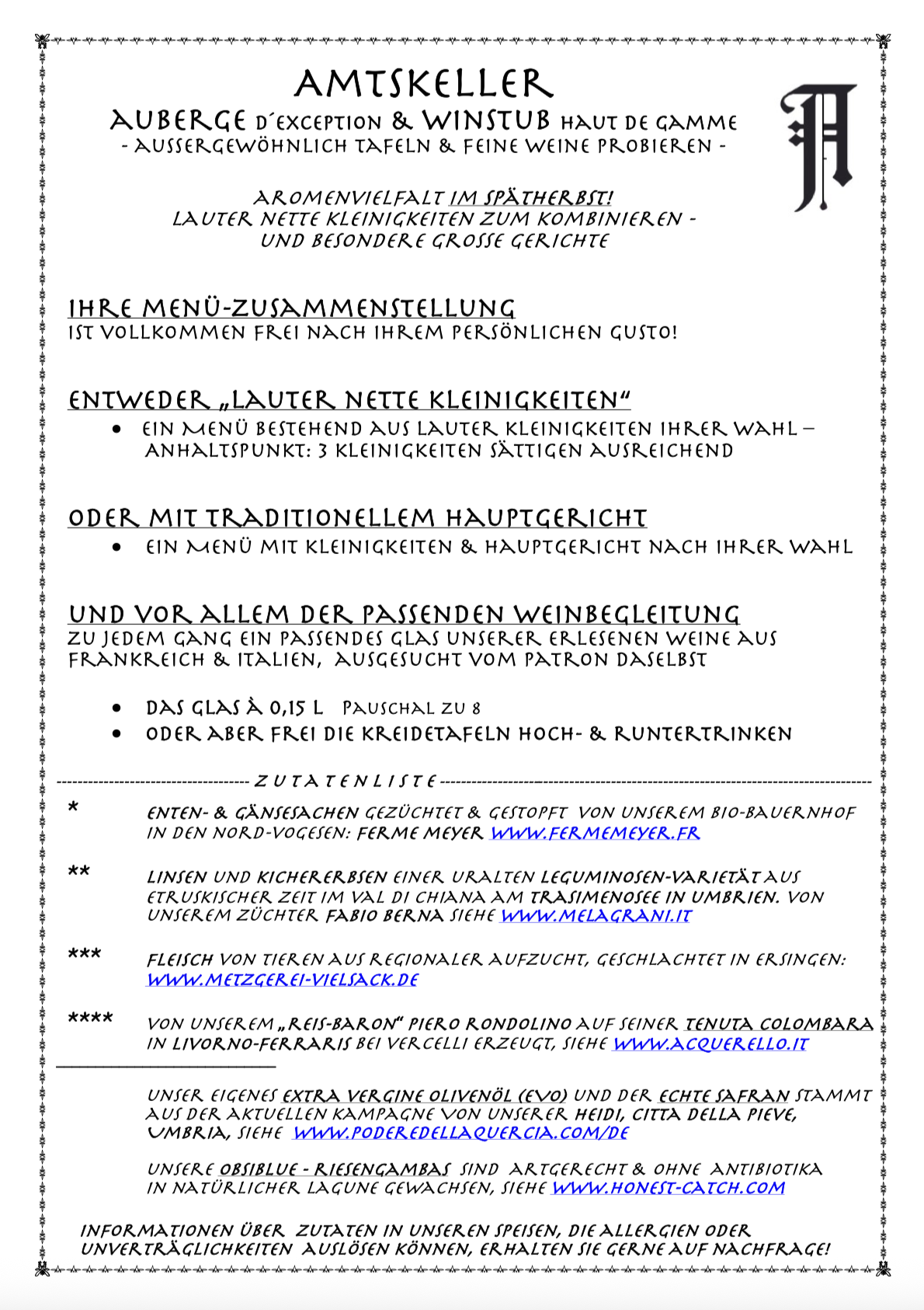 Mittwochs ab 18 Uhr zusätzlich zu Fine Dining als lockeres Feierabendformat WEINTRINKABEND mit Kleinigkeiten